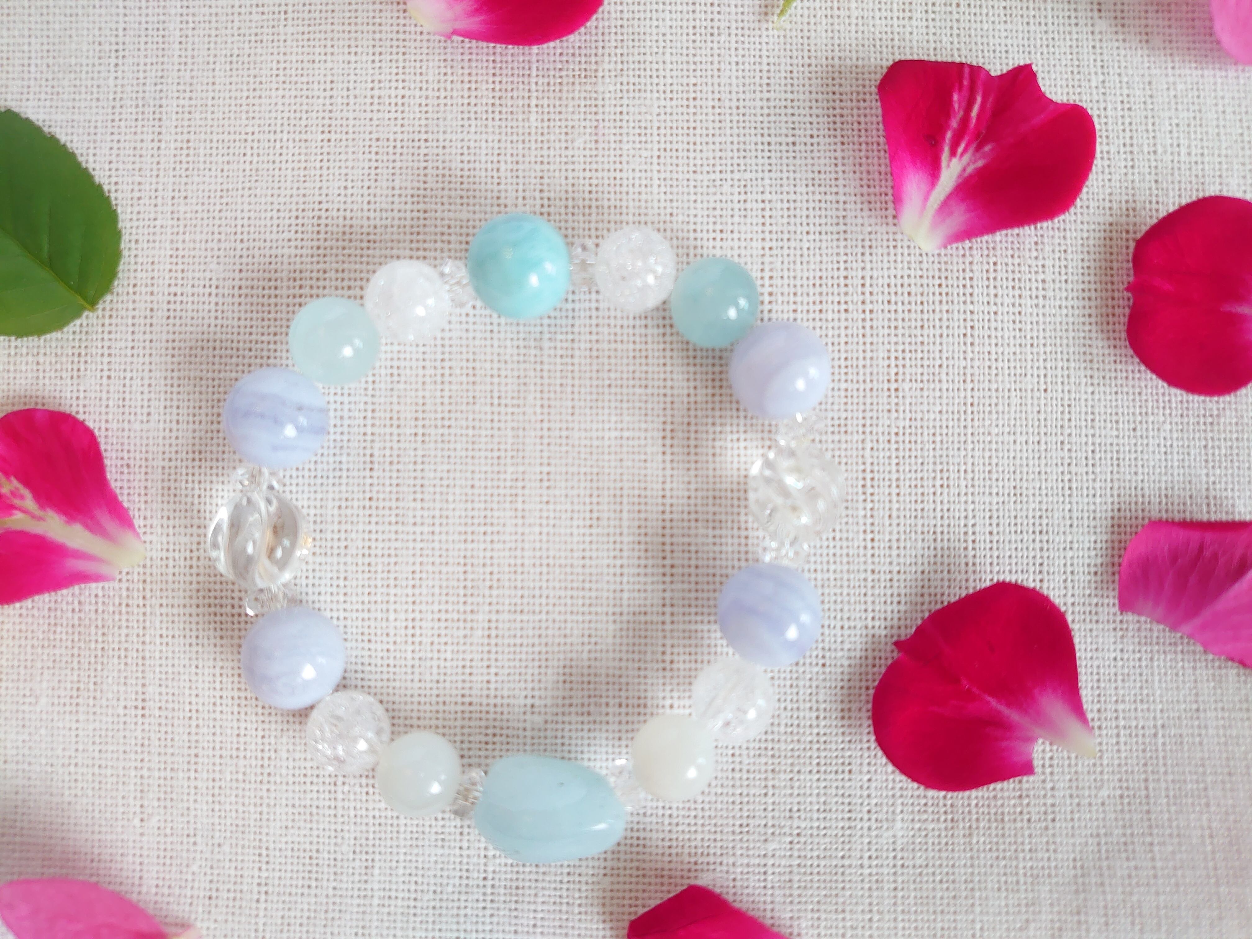 喉のチャクラをサポートする石をチョイスして作ったお洒落な天使ブレス。